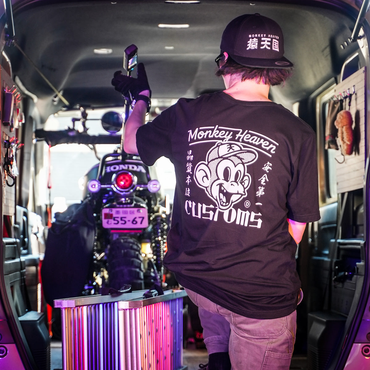 キャップをかぶったサルのグラフィックが印象的な「Monkey Heaven CUSTOMS」バックプリントTシャツ。遊び心あるデザインと和風テイストの文字が融合し、バイクやストリートファッションに映える一枚です。